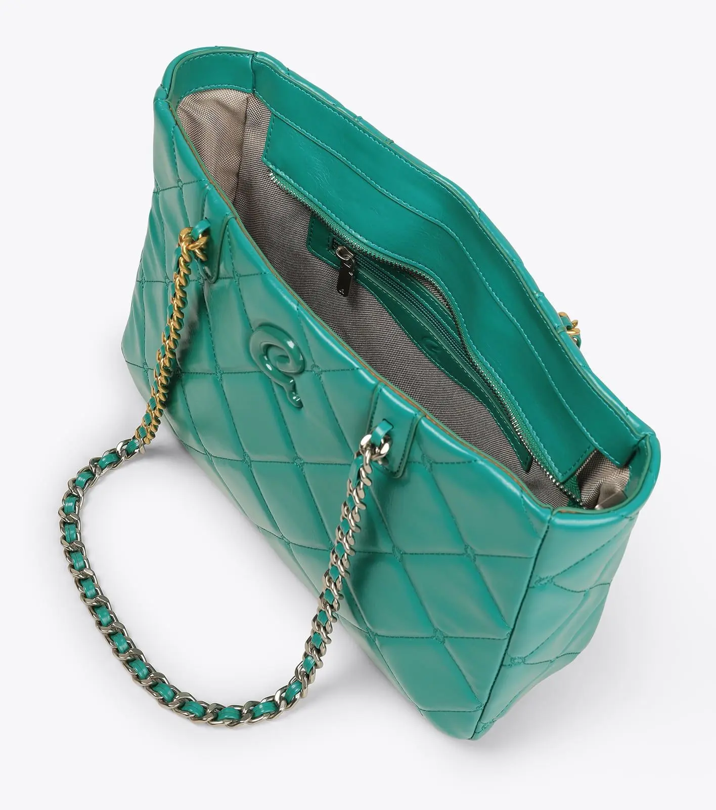 Γυναικεία τσάντα ώμου με αλυσίδα από συνθετικό δέρμα υψηλής ποιότητας. Εσωτερικά είναι επενδυμένη με φόδρα και διαθέτει τσέπη με φερμουάρ. Κλείνει με φερμουάρ στο πάνω μέρος.